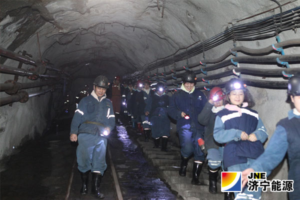 8:30,女工们换上下井服,带上安全帽、矿灯,扎紧自救器,穿戴整齐后在副井等候室集合。大多数女工是第一次下井,既新鲜又兴奋,对即将开始的体验充满期待。在安监处管理人员讲解了下井安全注意事项后,经检身人员检查后依次进入罐笼,到达-312大巷。在工作人员的指导下大家勇敢而笨拙地坐上猴车,到达1308轨顺联络巷。此时,极陡的下坡,湿滑的路面,黑漆漆的巷道,都让大家步行倍感艰辛,心里绷紧了弦。一番跋涉,几经辗转后,终于到达1308采煤工作。大家扶着支架小心地向下走,由于工作面环境复杂,即使人人拿出十二分的精神仍然不时听到安全帽被磕碰的声音。工作面行进途中,洗煤厂女工吕华惊喜偶遇自己的丈夫,阳城煤电2014年采煤机操作维修工状元、综采二区职工刘方。两人井下相见,相互叮嘱要注意安全,要认真工作,场面温馨而感动。前面的行程,大部分人尚可坚持,但是经过1308皮带顺槽联络巷,有许多人就已体力不支了,巷道内温度升高,汗水浸湿了衣衫,脸上汗水沾了煤灰一个个成了大花脸。特别是回程时,站在陡峭的巷道下端很多人已是望而生畏,就连平时自称“女汉子”的女职工也不禁喊累。大家想到自己只是行进就已如此,井下职工却还要进行长时间繁重的体力劳动,其辛苦可想而知,想到此不少女职工已是眼眶湿润。刘雷一遍遍加油鼓劲,教大家调整呼吸,注意节奏,大家坚持再坚持,终于完成了这场陡坡登高的“攻坚战”。